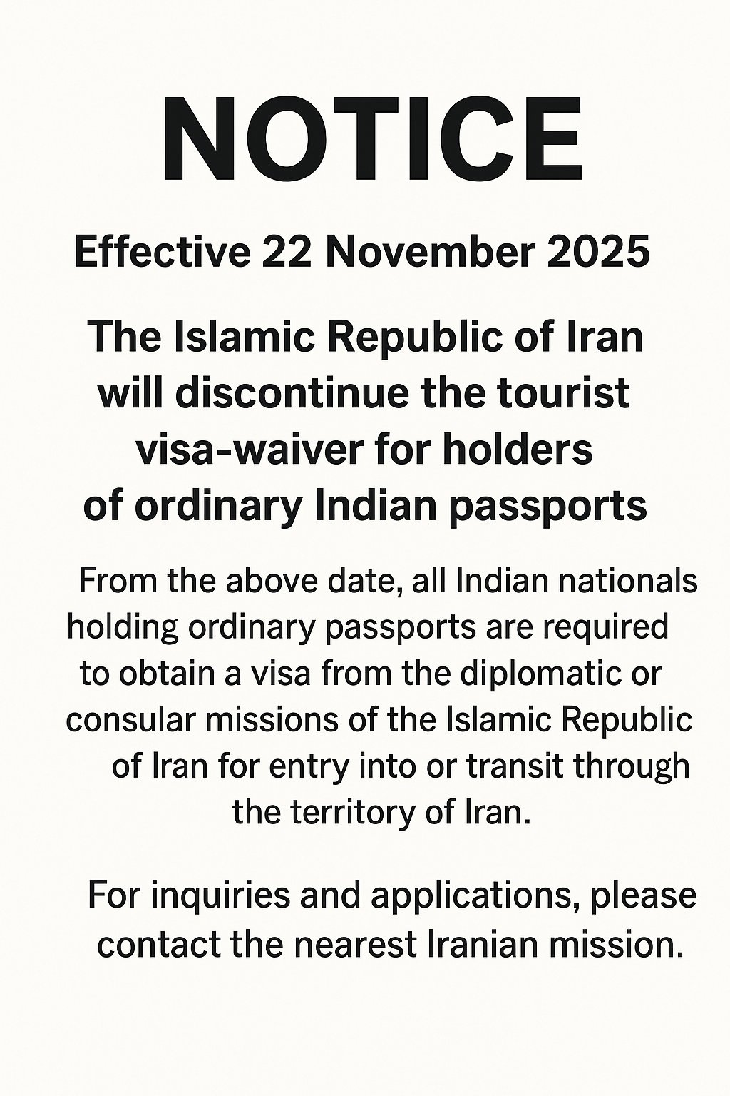 از تاریخ ۱ آذر ۱۴۰۴، جمهوری اسلامی ایران لغو معافیت ویزای گردشگری برای دارندگان گذرنامه عادی هندی را اجرا خواهد کرد.